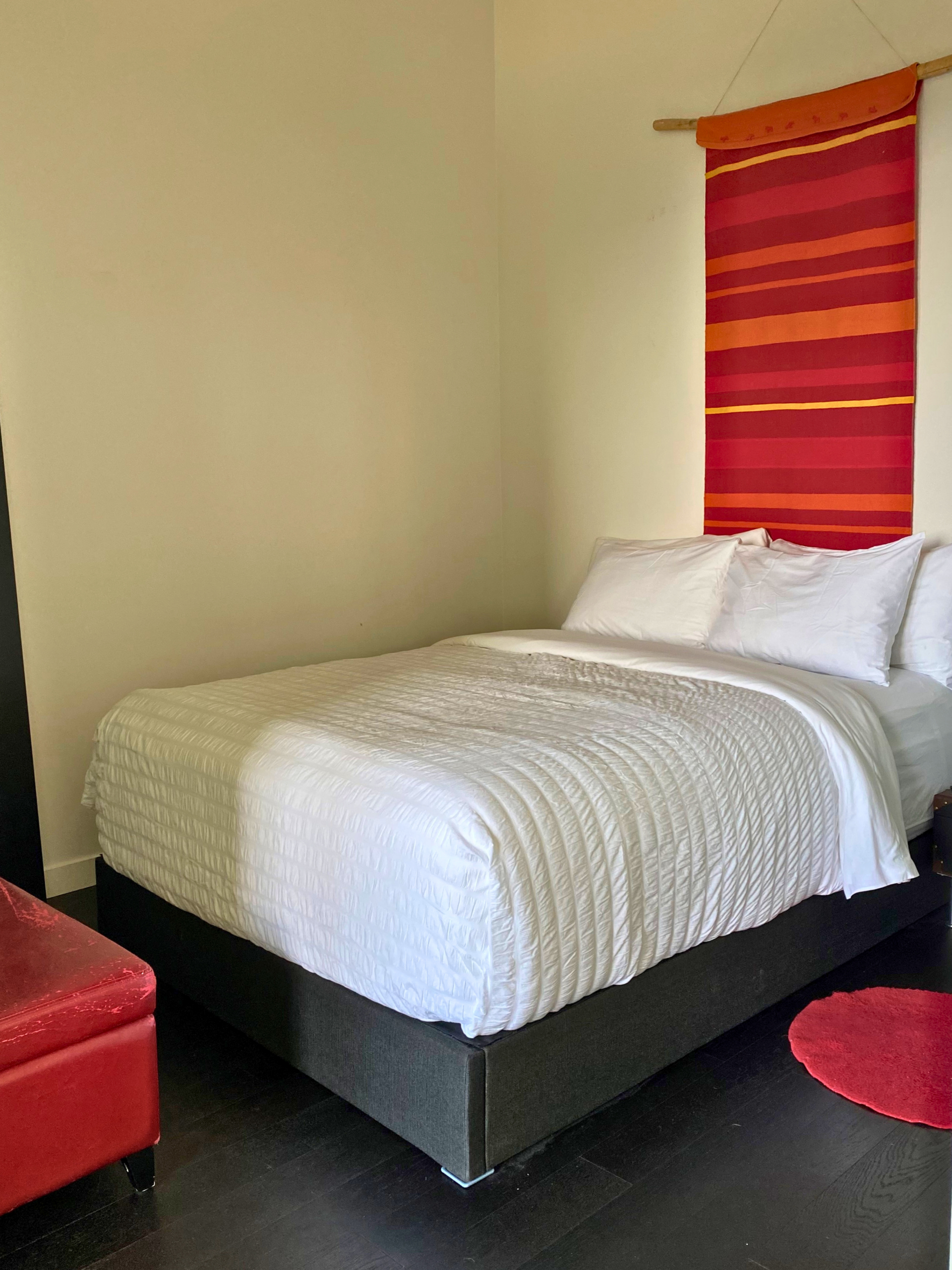 This non-smoking, family- and pet-friendly suite is thoughtfully designed to provide a peaceful urban escape. Floor-to-ceiling windows fill the space with natural light, while a private patio overlooking the quiet inner courtyard offers a tranquil place to unwind. The décor is warm, comfortable, and inviting, creating a cozy atmosphere that complements the building’s historic character.