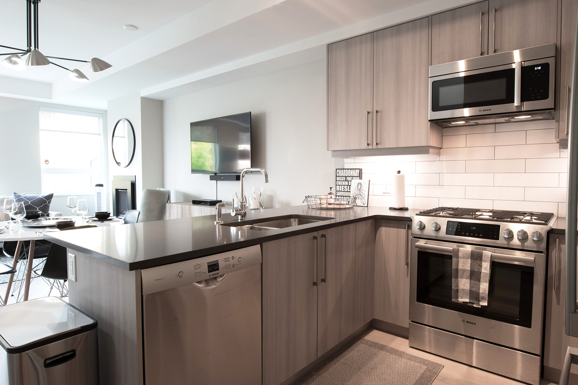 – The fully equipped kitchen boasts brand new Bosch appliances, including a gas stove—a rare find in downtown apartments. It includes all necessary cookware and utensils, ensuring you have everything needed for home-cooked meals.