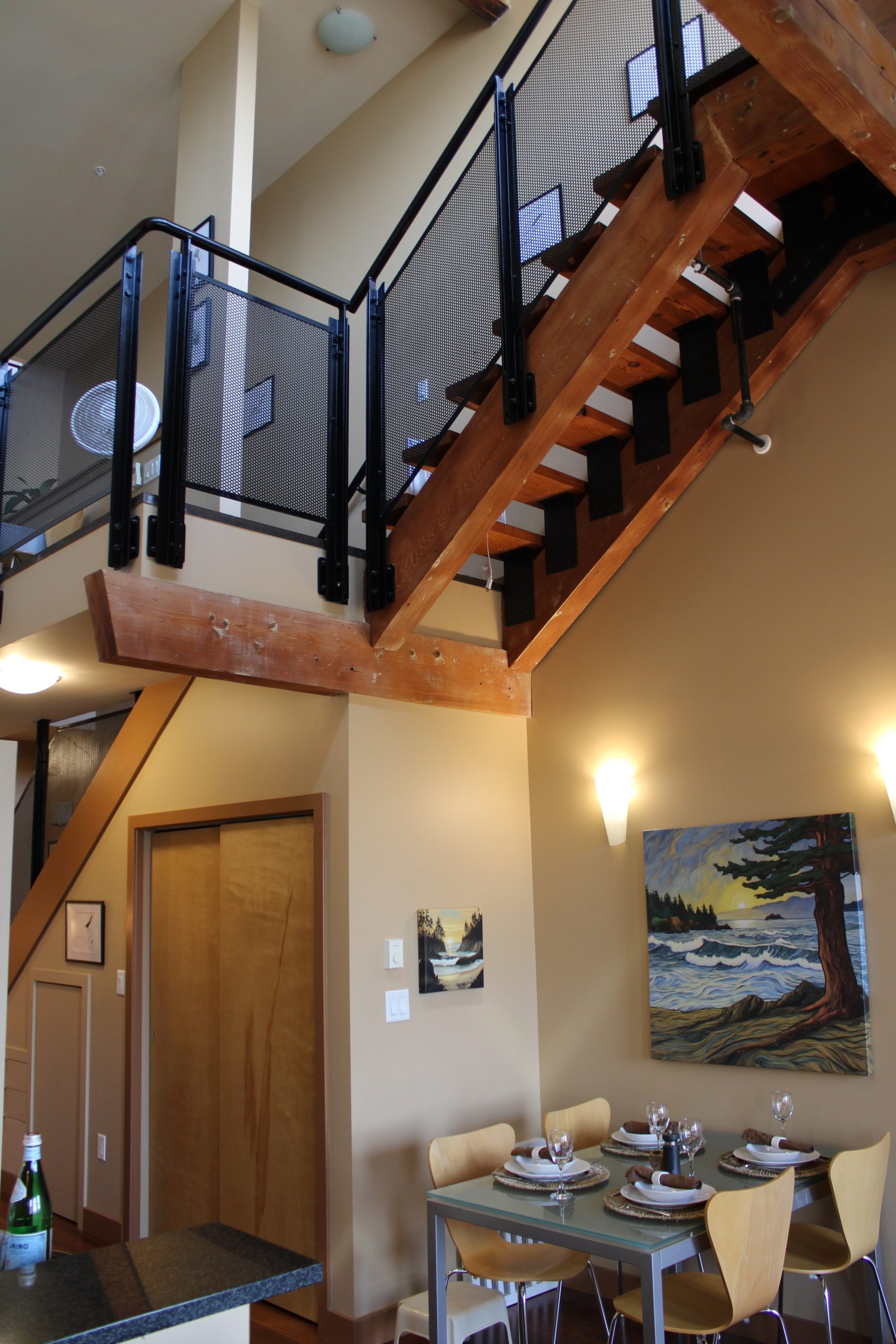 The Vogue Perch features over 1000 square feet of living space, showcasing 25-foot ceilings, exposed brick, and original heritage fir beams. Large windows flood the main living area with natural light, creating an inviting atmosphere perfect for relaxation or entertaining.