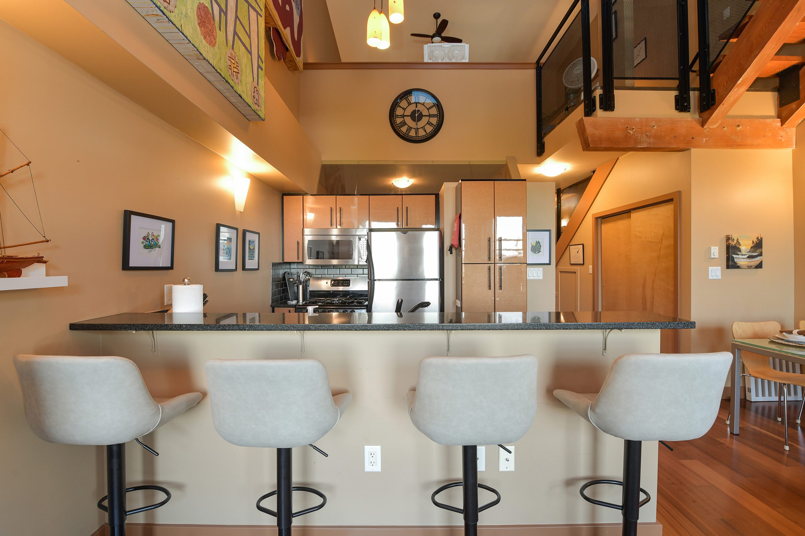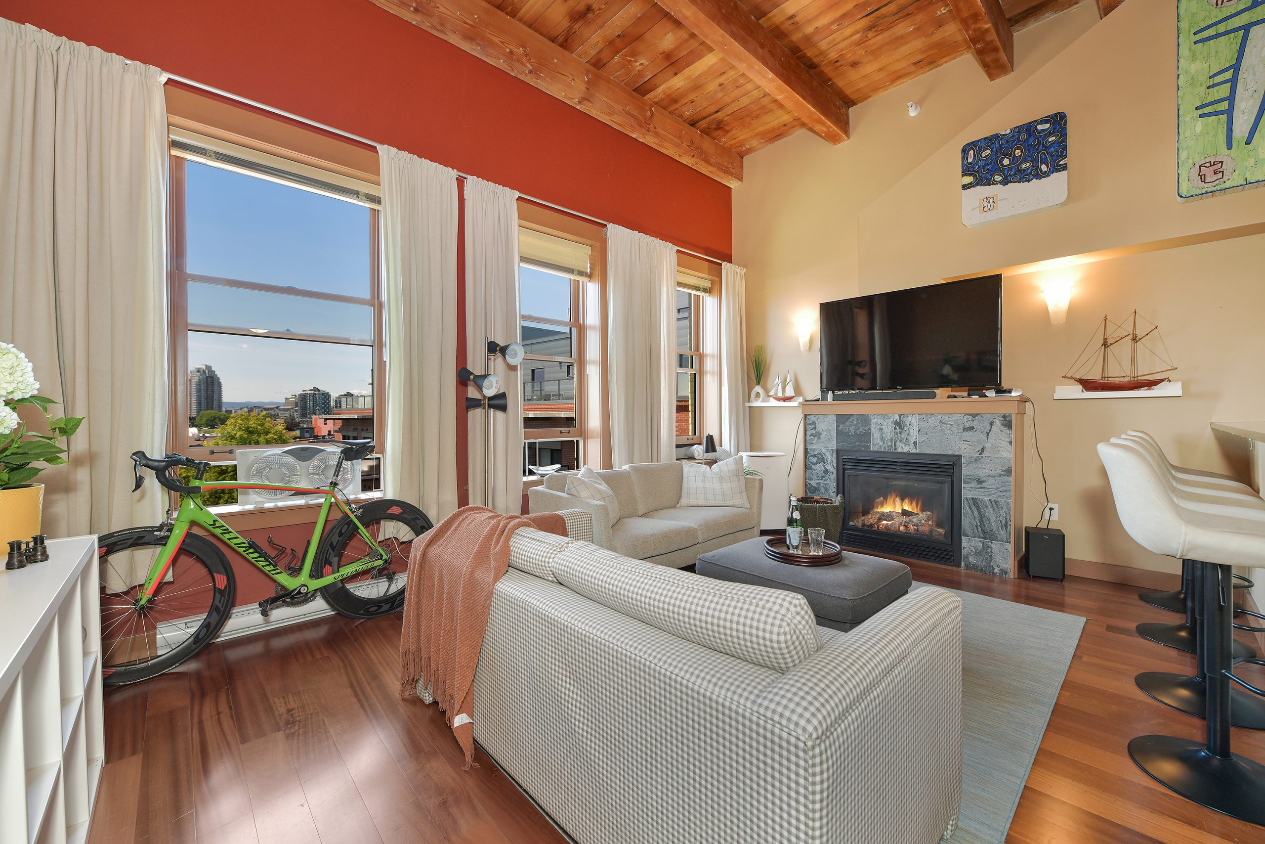 This stunning two-level penthouse loft features a private west-facing rooftop terrace and is located in “The Vogue” — a beautifully restored 1892 heritage building blending classic character with contemporary design. Inside, you’ll find soaring 21-foot ceilings, exposed original timber beams, and three expansive picture windows that flood the space with natural light. The loft offers picturesque views of Market Square, surrounding rooftops, and the iconic Johnson Street Bridge.